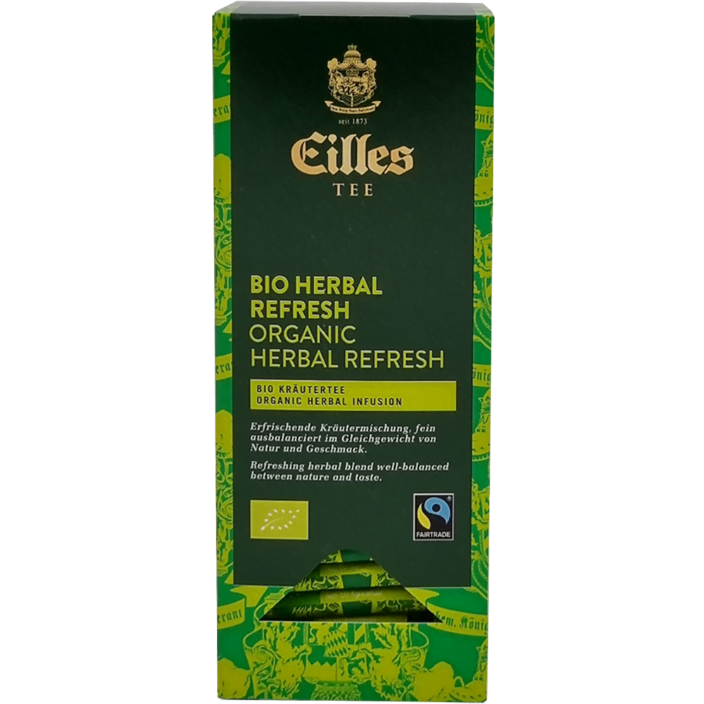 EILLES TEE Bio Herbal Refresh to „odpowiedzialna” przyjemność picia herbaty. Wysokiej jakości produkty oparte na wyselekcjonowanych surowcach zgodnie ze standardami Fairtrade od dawna zajmują stałe miejsce w asortymencie firmy J. J. Darboven. Dlatego jest dla nas rzeczą oczywistą, że oferujemy naszym klientom również herbatę z takim certyfikatem. Ponadto składniki pochodzą z kontrolowanych upraw ekologicznych i są oznaczone oficjalny symbolem BIO.
