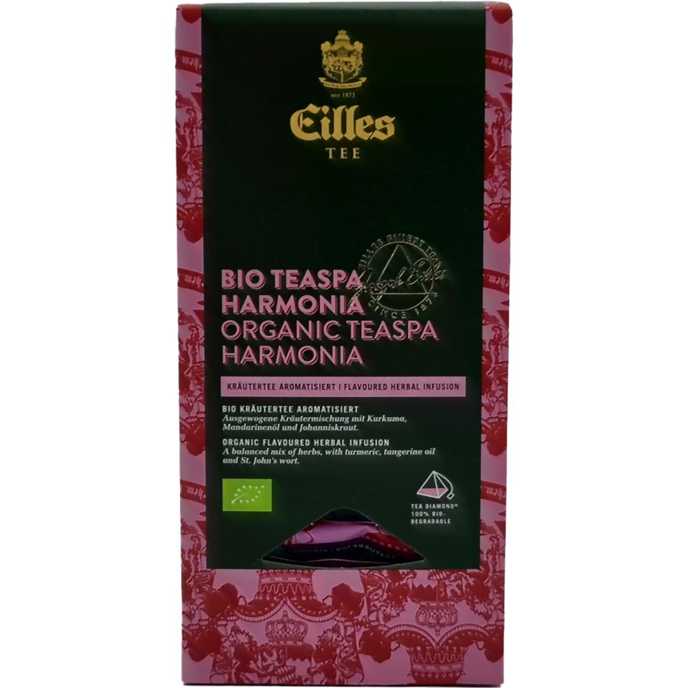 EILLES TEE Diamond Bio Tea Spa Harmonia to aromatyzowana herbata ziołowa z certyfikatem BIO. To wspaniale zbilansowana mieszanka ziół z kurkumą i mandarynką. Dla wewnętrznej harmonii została wzbogacona dziurawcem, chmielem i orzeźwiającą trawą cytryną.