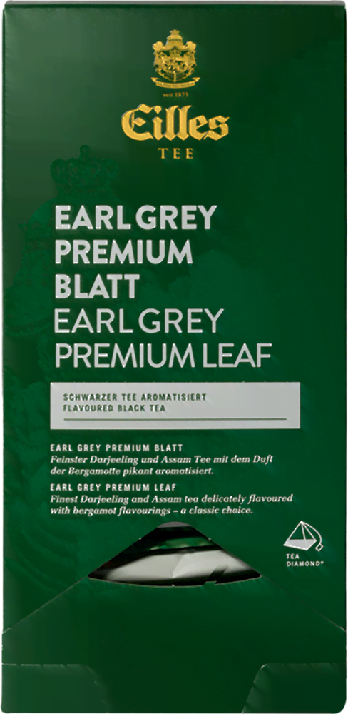 EILLES TEE Diamond Earl Grey to szlachetna herbata, której liście pochodzą z Cejlonu, Chin i indyjskiego regionu Darjeeling. Wyróżnia się dodatkiem lekko pikantnego olejku aromatycznego z owoców bergamotki. Najczęściej serwowana i najbardziej klasyczna z herbat aromatyzowanych.