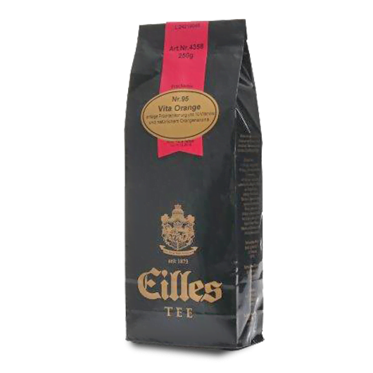EILLES TEE Vita Orange nr 95 to orzeźwiająca kompozycja jabłek, cząstek pomarańczy i cytryny, płatków hibiskusa oraz dzikiej róży. Herbata owocowa wzbogacona jest o zestaw 7 witamin. Napar Vita Orange wyróżnia się świeżym, naturalnym aromatem pomarańczy.