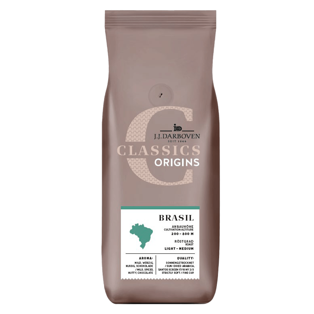 J.J. Darboven Classics Origins Brasil to średnio palone ziarna pochodzące z plantacji w Brazylii. Kawa charakteryzuje się łagodnym smakiem o orzechowo-czekoladowej nucie.