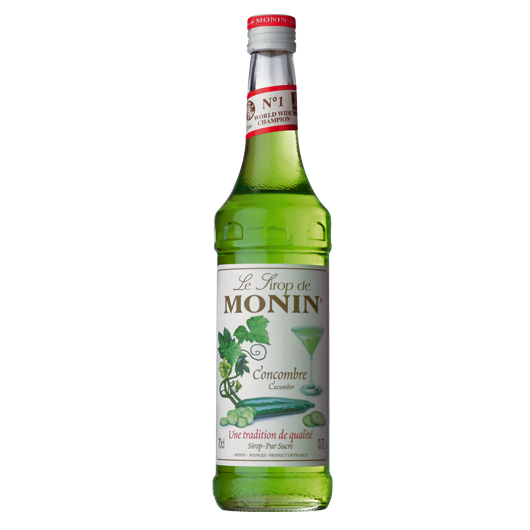 Syrop MONIN o orzeźwiającym smaku ogórka. Wyróżnia się żywą, zieloną barwą.