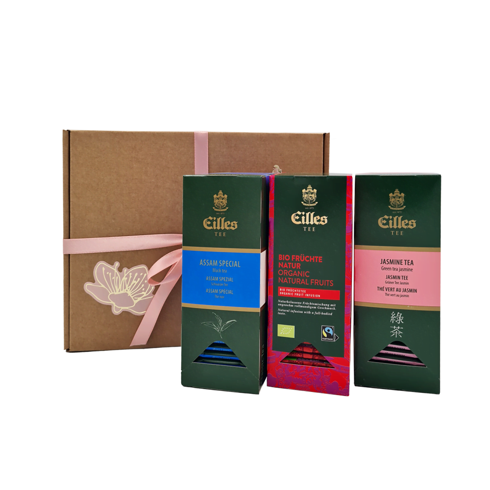 Zestaw prezentowy „Przy Herbacie” składa się z herbat EILLES TEE: zielonej Jasmin Tea, owocowej Fruechte Natur oraz czarnej Assam. To doskonały prezent dla mamy, przyjaciółki siostry.